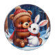 Illustration of a cheerful teddy bear cuddling a bunny during a snowy winter night, surrounded by festive holiday decorations and a colourful toy train.