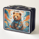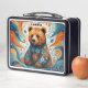 A cute, brown bear decorated with colourful concentric circles, and swirling colours in the background makes a darling lunch box for a boy or girl.