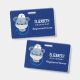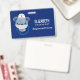 Name badge with a cute illustration of a blue bear wearing a nurses hat with a little heart on it. Also wearing a protective face mask and has a blue stethescope too.