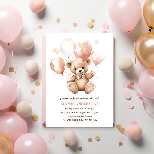 Cute Bear With Balloons | Baby Pink Enclosure Card