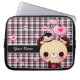 Cute chocolate bear with pink heart shaped balloons on pink and black plaid laptop sleeve. Choose the size to fit your laptop and change the text to personalise it.