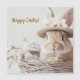 cute beautiful bunny in a hat in a basket with flowers for Easter