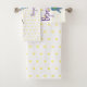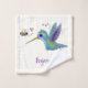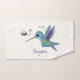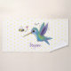 This cute design features a green and purple happy hummingbird with a bee friend on a yellow polka dot background . All done in happy cartoon illustration style!