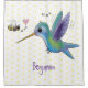 This cute design features a green and purple happy hummingbird with a bee friend on a yellow polka dot background . All done in happy cartoon illustration style!