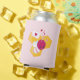 A can cooler with a sweet image of a pink and white striped bumble bee. A piece of yellow honeycomb behind. A letter sealed with a heart and a group of floating hearts are also part of the design.