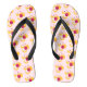 Flipflops with a repeating pattern designed with an image of a pink and white striped bumble bee. A piece of yellow honeycomb behind. A letter sealed with a heart and a group of floating hearts are also part of the design.