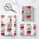 The repeated pattern on these Christmas wrapping paper sheets is an image of an adorable Bichon Frise dog peeking out from a red and white Holiday gift bag. Behind him is a sprig of holly and red berries. Stylised red and black buffalo plaid text says MERRY CHRISTMAS". The background on two of the sheets in this set is white, while the third sheet is silver.