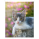 A cute little blue white kitten resting on a rock in front of pink flowers watching curiously, photo taken by Katho Menden in Rhodos, Greece. This animal photo on a photo paper poster is a gift idea for cat lovers. -