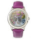 A cute little blue white kitten resting on a rock in front of pink flowers watching curiously, photo taken by Katho Menden in Rhodos, Greece. This girls wrist watch with dial-plate is a gift idea for cat lovers.