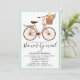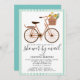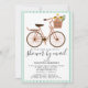 Cute bicycle with a basket full of daisies and a baby shower invitation. It is framed with blue stripes and a blue background on the back. Shower by Mail is written in a script font.