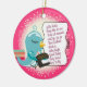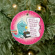 Cute little seamstress bird with a fabric stash and sewing machine on this Christmas tree ornament for your favourite yarn crafter. Funny little rhyming poetry and retro snowflakes background.