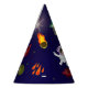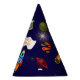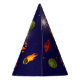 Cute party hat features astronaut, space, comet, Saturnus, planet, stars, moon, and rocket.