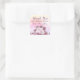 Cute pink cat with purple flowers thank you sticker for baby girl birthday celebration.