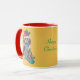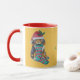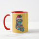 The cute puppy on this customisable christmas mug is looking very festive wearing his red santa hat with a sprig of holly in it. The little brown and black puppy dog is holding his red and green stripy Christmas stocking in his mouth as he eagerly awaits a visit from Santa Claus to fill his stocking with lots of gifts and other doggy treats. He looks very special on this original christmas holiday mug. You can personalise this uniquew mug by adding your own text if you wish to do so.