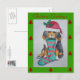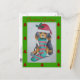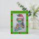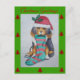 This cute little black and brown mixed breed Christmas puppy is looking very festive wearing his red santa hat with a sprig of holly in it. He's holding his red and green stripy Christmas stocking in his mouth as he eagerly awaits a visit from Santa Claus to fill his stocking with lots of gifts and other doggy goodies. He looks very special on this seasonal postcard. The cute little puppy design really stands out against the festive green background and has the greeting Happy Christmas written above in red lettering I think this original postcard with the cute little water-color puppy picture makes great Christmas send for someone special for this Christmas holiday.