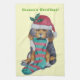 The cute little black and brown mixed breed Christmas puppy on this towel is looking very festive wearing his red santa hat with a sprig of holly in it. He's holding his red and green stripy Christmas stocking in his mouth as he eagerly awaits a visit from Santa Claus to fill it with lots of gifts and other doggy goodies. The cute little puppy dog christmas towel will stand out wherever he hangs. This cute towel white makes a lovely Christmas edition to any christmas kitchen this holiday time. The original puppy illustration is painted in watercolor and goes nicely with the Christmas tabby kitten. This is a customisable christmas towel, you can personalise it with your own text.
