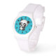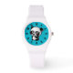 A cute and adorable illustration of a black and white panda bear sitting down and looking happy, friendly and loveable. Turquoise blue background.
