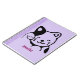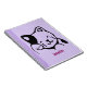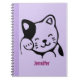 A spiral notebook designed with an illustration of a smiling and waving kitty cat with a black spot around his ear. Purple background with a polka dot pattern on the side. Simple cute and adorable.