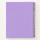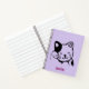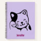 A personalised spiral notebook designed with an illustration of a smiling and waving kitty cat with a black spot around his ear. Purple background. The back cover has a purple polka dot pattern. Simple cute and adorable.