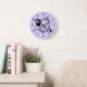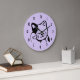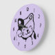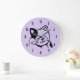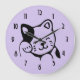 A clock designed with an illustration of a smiling and waving kitty cat with a black spot around his ear. Purple background. Simple cute and adorable.