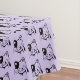 A tablecloth designed with an illustration of a smiling and waving kitty cat with a black spot around his ear. Purple background. Simple cute and adorable.