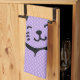 A kitchen towel designed with an illustration of a smiling and waving kitty cat with a black spot around his ear. Purple polka dot background. Simple cute and adorable.