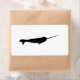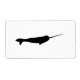 A narwhal whale silhouette in black and white swims with fins and a long spiralling tusk. An original digital artwork.