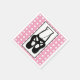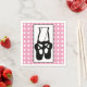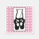 Paper napkins with a black illustration of a ballet dancers slippers and her lower legs which are transparent allowing the colour of the item to show through. Ballerina is standing on her toes, en pointe. Background is a pattern made of white polka dots on pink.