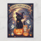 "Wish someone a 'Happy Purr-O-Ween!' with this adorable and festive postcard. The design features a cute black cat wearing a witch hat and a little ginger kitten, both perched atop glowing jack-o'-lanterns. Set against a spooky, moonlit background of twisted trees, the scene includes playful elements like flying ghosts, magical potions, and falling autumn leaves. It's the perfect way to send a fun, heartwarming Halloween greeting to friends, family, or any cat lover in your life this fall season!"