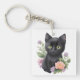 Cute Black Cat Floral Whimsical Key Ring