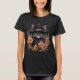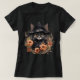 T-shirt with a cute illustration. A black long-haired cat wearing a black witch's hat. It's ears poking out. Surrounded by orange and brown autumn flowers. Perfect for cat lovers.