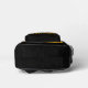 Funny cat backpack featuring a cute black kitty looking forward to an adventure. The background is a ochre patterned design with black faux leather.