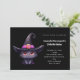 A birthday invitation with a fun Halloween illustration for cat lovers. A big-eyed black cat wearing a large black witch's hat with a purplish pink belt around the brim.