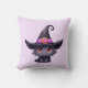 Pillow with a fun Halloween themed illustration for cat lovers. A big-eyed black cat wearing a large black witch's hat with a purplish pink belt around the brim.