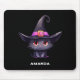 Mousepad with a fun Halloween themed illustration for cat lovers. A big-eyed black cat wearing a large black witch's hat with a purplish pink belt around the brim.