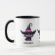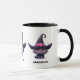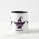 A mug with a fun Halloween themed illustration for cat lovers. A big-eyed black cat wearing a large black witch's hat with a purplish pink belt around the brim.