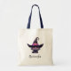 Tote bag with a fun Halloween themed illustration for cat lovers. A big-eyed black cat wearing a large black witch's hat with a purplish pink belt around the brim.