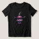 T-shirt with a fun Halloween themed illustration for cat lovers. A big-eyed black cat wearing a large black witch's hat with a purplish pink belt around the brim.