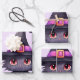 Wrapping paper sheets with a fun Halloween themed illustration for cat lovers. A big-eyed black cat wearing a large black witch's hat with a purplish pink belt around the brim.