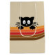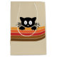 Abstract retro style illustration with yellow, orange, red and brown stripes and black cute cat decoration on beige background for every cat and retro lover. It is easy to customise it by adding your name/monogram etc.