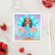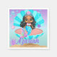 Cute African American Mermaid Princess wearing a pearl & seashell tiara in front of an open oyster bed on a purple blue ombre background. Starfish, Coral, and Sand Elements. Customise with your child's name. Great for Mermaid Birthday Party.