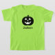 Lime green (can be modified) Halloween shirt features a spooky-cute black and white jack o lantern pumpkin and custom black text that can be personalised with your child's name.