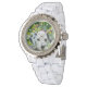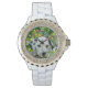 A cute seven weeks old black spotted  Dalmatian puppy, portrait in a flowery garden. The puppy-eyed baby doggy photo taken by Katho Menden, this rhinestone watch for women with dial-plate is an enchanting gift idea for dog lovers.  http://www.zazzle.com/kathom_photo