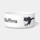 Painting of a cute black and white tuxedo cat done in pointillism, is printed on custom personalised pet bowls. Be sure to customise the name and to select the size bowl that you want.
