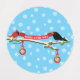 A cute blackbird and a cardinal on a snowy branch of a holly tree with two hanging red Christmas balls. They are wishing you a "Merry Christmas". On the background are snowflakes.
