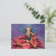 Fantasy card with a cute blonde fairy sitting in a bouquet of red orchids.