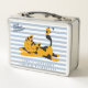 NewParkLane - Here comes trouble! Cute Lunchbox, with a sweet sleeping cat cartoon in orange and blue and a little bird on its tail, against a soft blue striped background, and a text template for your name, schoolname or other personal message.