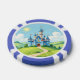 Cute blue and white castle with red flags on a bright summer day. This beautiful whimsical illustration with the sun, clouds, blue sky and green hill grass.