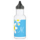 This adorable water bottle features white flowers with a blue background and fancy lettering for personalisation.