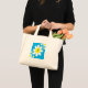 This adorable tote features white flowers with a blue background and fancy lettering for personalising initial.